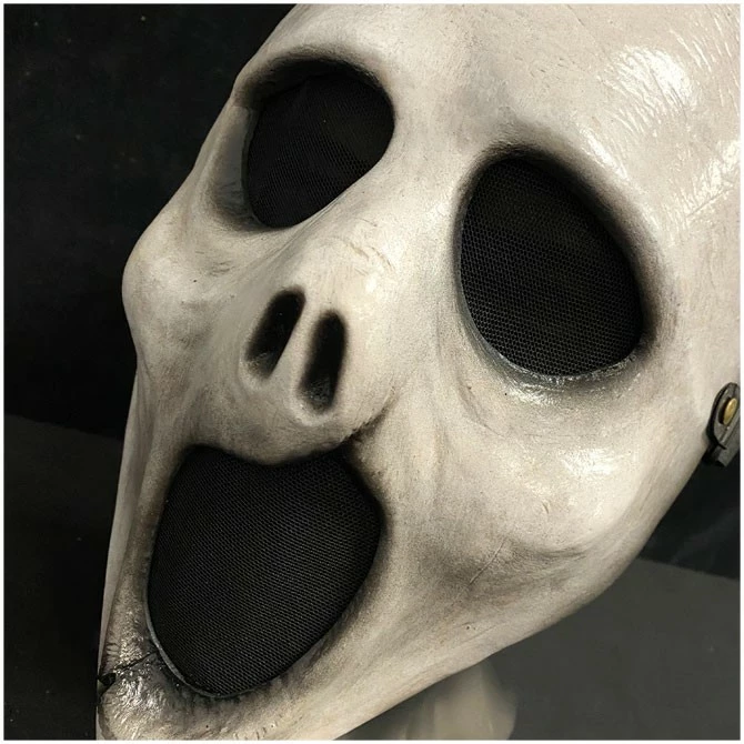 This is an incredibly haunting mask, handmade from thick resin and handpainted in creepy white tones. This mask has been hand sculpted, has real leather straps, mesh eye covering and high quality buckles.