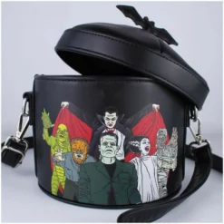 Trick or Treat in style this Halloween season with our Universal Monsters x Cakeworthy Bucket Purse. Featuring all of the classic monsters from your favorite creature features– the Mummy, Creature from the Black Lagoon, Dracula, the Wolfman, Frankenstein and his Bride. Oh, and we obviously can’t not mention that spooktacular bat detailing on the top–– *Dracula kiss*