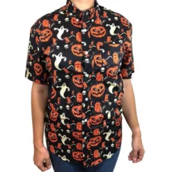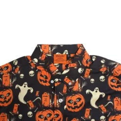 This button-up boasts a graveyard full of vintage Beistle artwork favorites, like the jack-o-lantern, skull, ghost, and an orange tombstone with a skeleton hand reaching out to say “hi.” With its ultra-fine feel, this button-up will keep you comfortable and looking drop dead gourd-geous — making it a must-have for any time of the year!