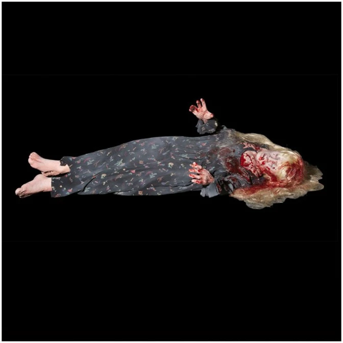 A life size prop of a poor woman who has met a ghastly end. She’s lying on her back with blood staining her dress and hair which has poured from a head wound.