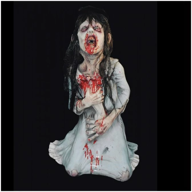 Dead Debby is a creepy zombie girl and she is hungry! She is kneeling down while enjoying chewing on a dismembered arm. Scarily detailed and blood soaked, this static prop is a great additional to your haunt or scare room.
