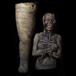 Also would be great in other types of themed event / escape room. This classic monster mummy prop is sure to impress. It is two pieces, an upper and lower part that fit together for display and come apart for storage. It is designed to lay down for display or can be leaned against a wall. It does not have a stand and is not designed to be hung or free standing. When the pieces are together the mummy is about 66 inches long.