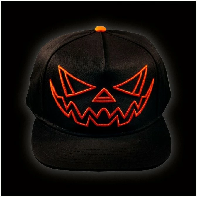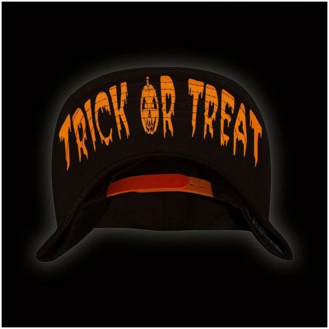It’s halloween everyday with this Pumpkin Basesball Hat, featuring an embroidered jack o lantern face on the front, and “trick or treat” printed on the brim.