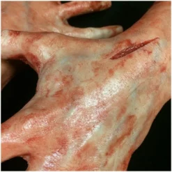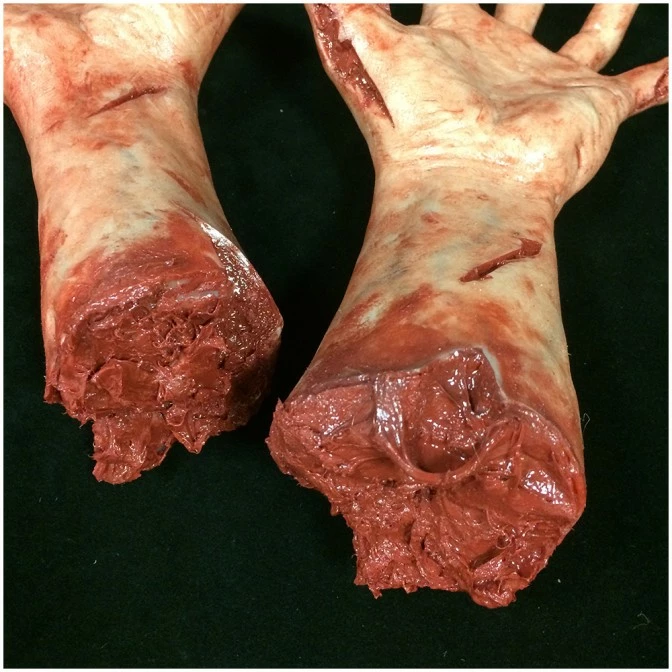 Solid silicone hand and wrist with a foam core in the forearm area. Highly detailed and film ready this prop is the perfect addition to your haunt or film set.