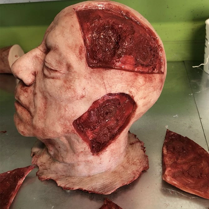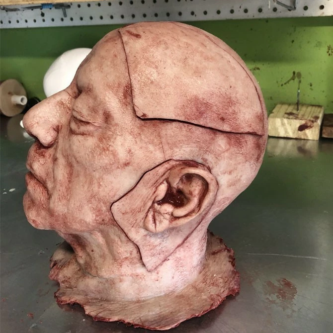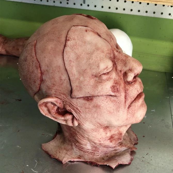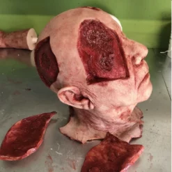 This severed head has four flaps of removable skin that are attached with strong magnets. The perfect addition to your escape room puzzles. Highly detailed and extremely durable this Piece is skinned with silicone and has a foam core. Each piece is individually made so each one is unique.ย