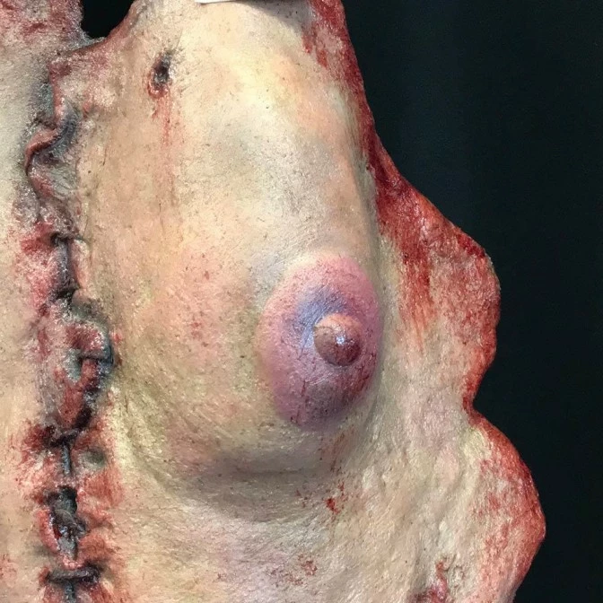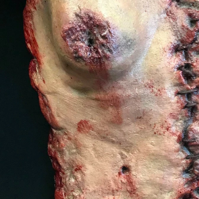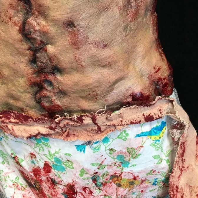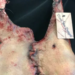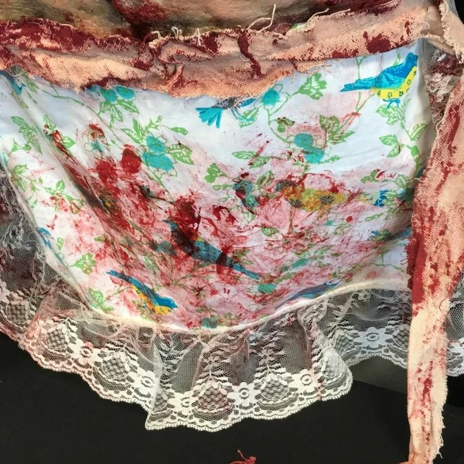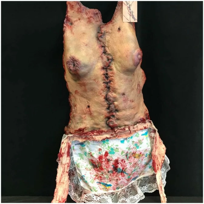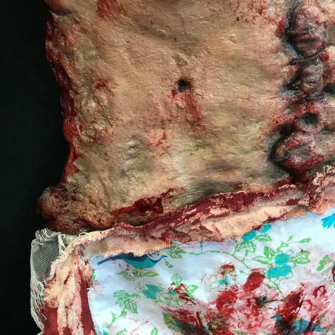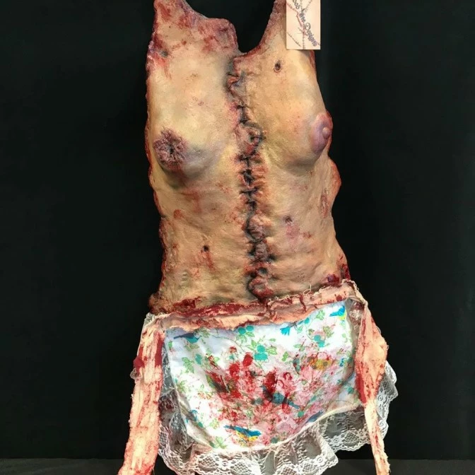 The apron is made of a latex skin female torso stitched with leather cord. The bloodied apron skirt is hand sewn with lace trim and canvas strip ties. As each piece is hand made and hand painted, there may be slight variations in detailing as each piece is an original.