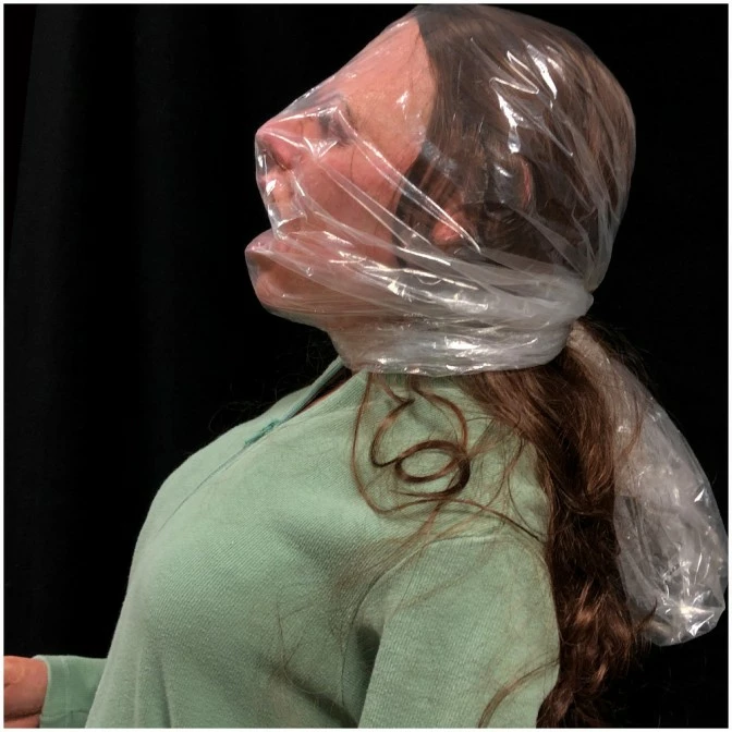 Abducted by a crazed killer, this poor girl has been bound and gagged and a plastic bag put over her head. She’s slowly suffocating whilst gasping desperately for air.