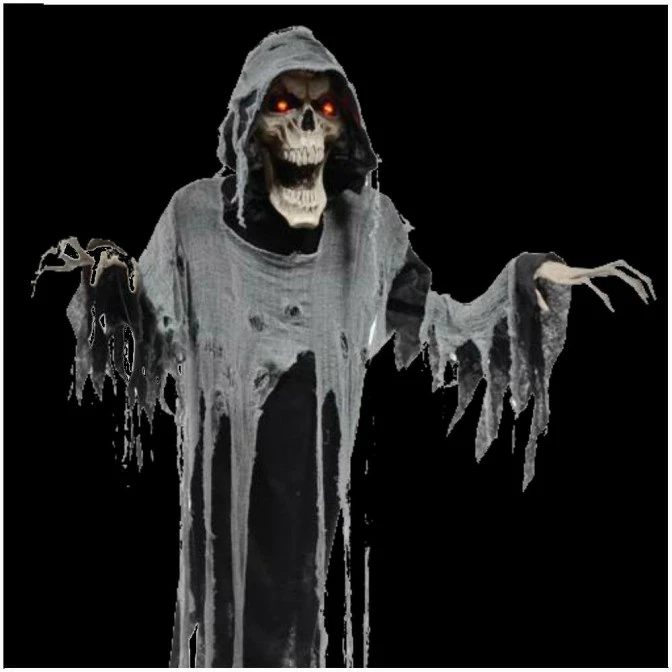 This 72-inch Hanging Reaper life-sized prop has blow-moulded elongated head and hands with poseable arms, light-up eyes, and a tattered costume with hood and gauze details! There is a motion-sensor activation to make him speak and there is even a  volume control. Great for your Halloween party or setting!