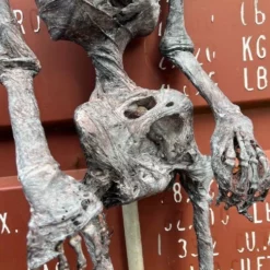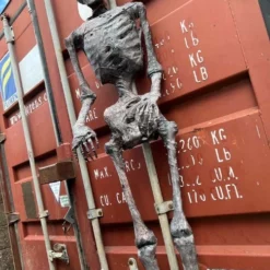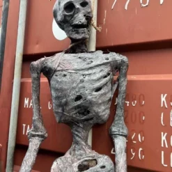 He is made of hard plastic and has wire jointed limbs and a moveable jaw. Perfect for a graveyard scene or a haunted house.