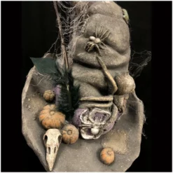This incredibly detailed witches hat is handmade by a team of UK based artists. The hat itself is a painted latex cast of a hand sculpted pointed hat, with other latex features added such as belt, pumpkin, spider and crow skull. It has then been aged and decorated with artificial spiders webs (not cotton) and real bird feathers. Each hat is individually crafted, meaning that no 2 hats are exactly identical, so in retrospect your hat may differ slightly from the one shown in the image.