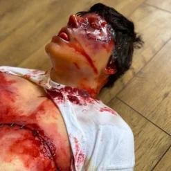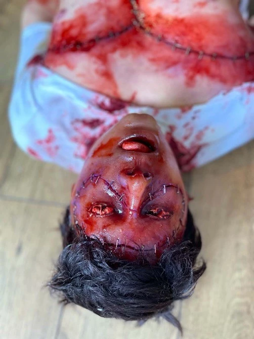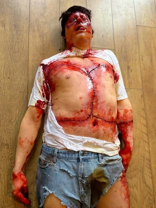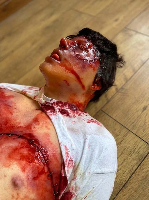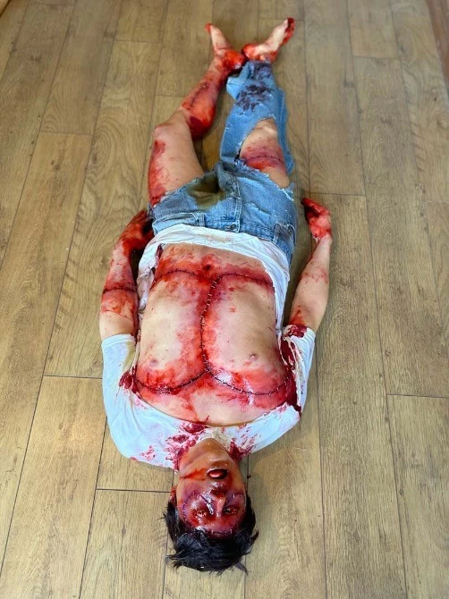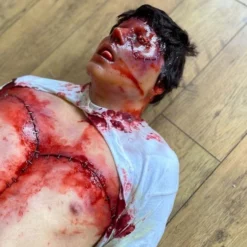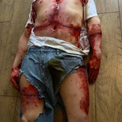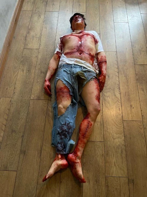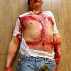 Life cast body, incredibly realistic with a high level of detail. Body has been chopped up and stitched back together.