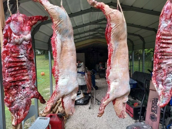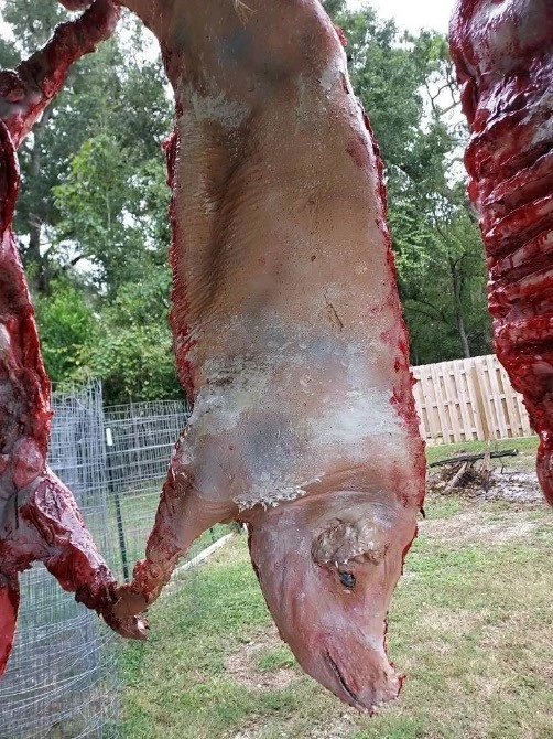 Life size half pig prop, hand sculpted and painted.