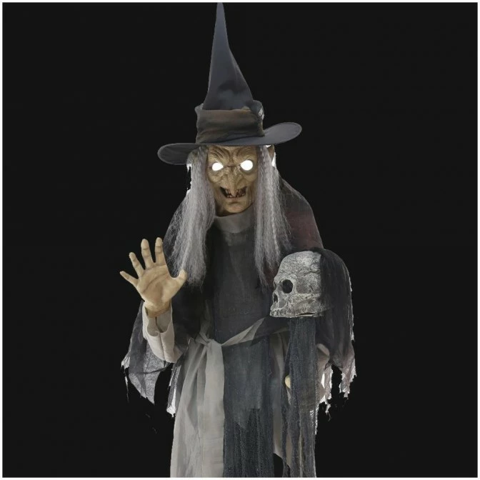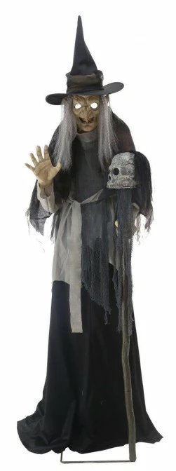 Standing over 6ft tall to the top of her pointed hat, this wicked wiccan features a soft PVC head with glowing light-up eyes, long stringy grey hair, an easy-to-assemble quick-connect metal frame, gnarled plastic hands and plastic staff with rotting skull topper. She is dressed in a black and grey fabric hooded costume with shredded-gauze details.