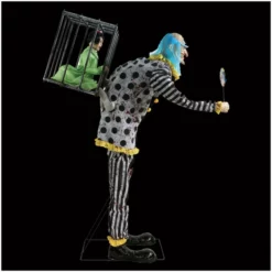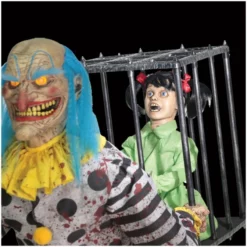 The Mr. Happy animated Halloween prop is a life-sized clown prop with lights and sound! Our creepy animated clown figure is bending over and extending a large lollipop in one hand while behind his back he is holding a large cage with a screaming child inside!