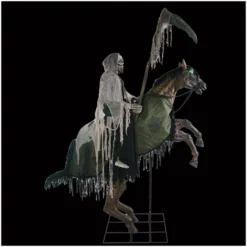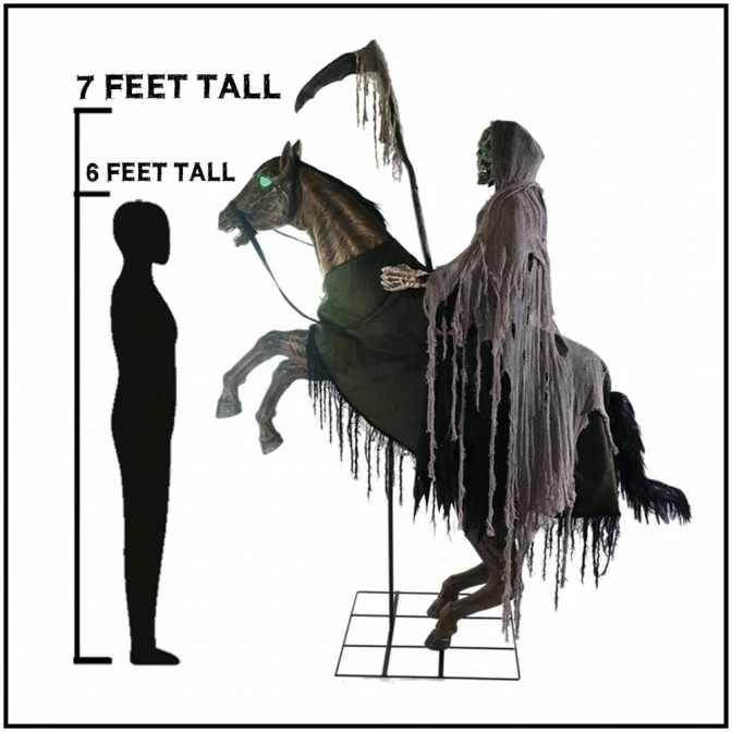 Galloping in from beyond the veil is the bloodcurdling reaper’s ride animated halloween prop! The nightmarish reaper sits atop an eerie steed that bucks its head with green light-up eyes and kicks its front legs.