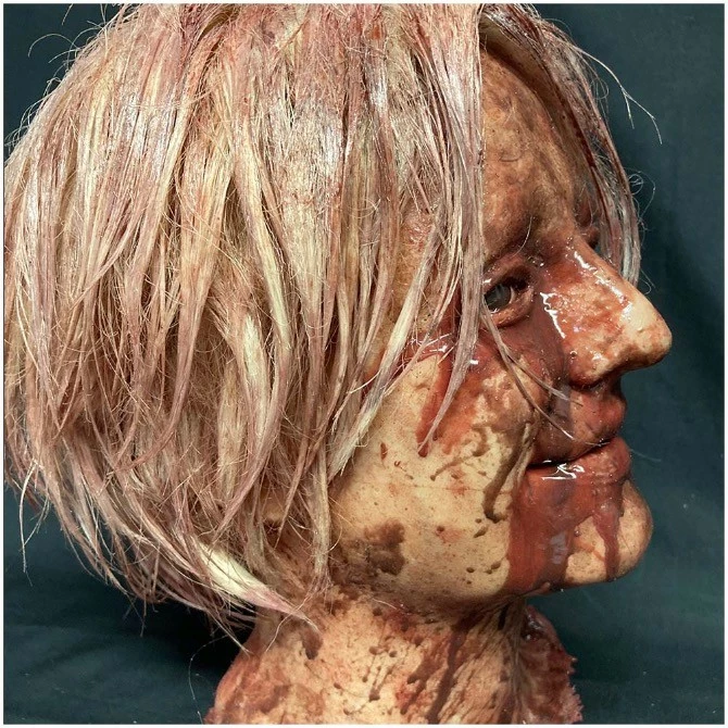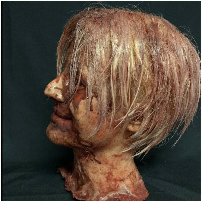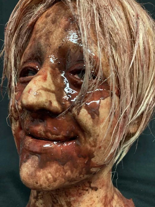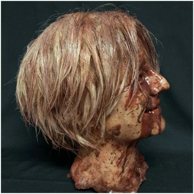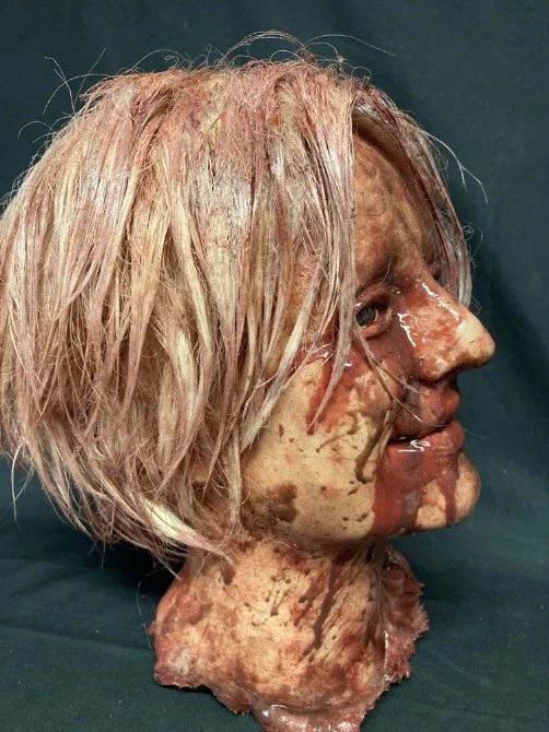 A highly detailed life cast female severed head made of silicone and hand painted by a specialist horror artist.
