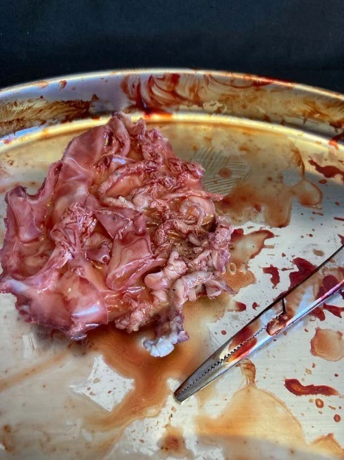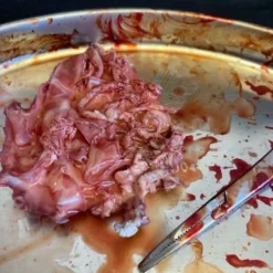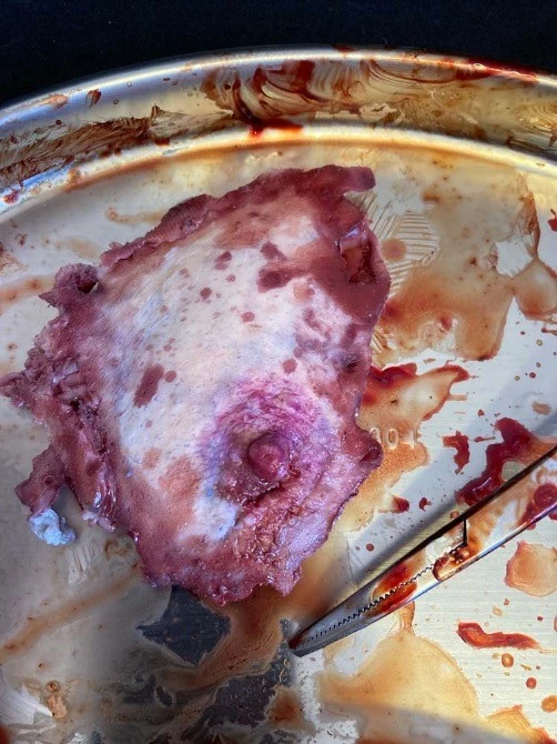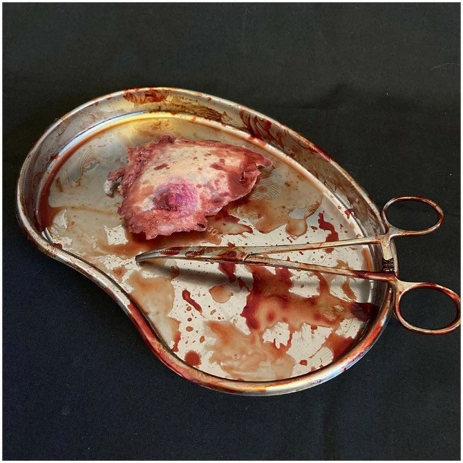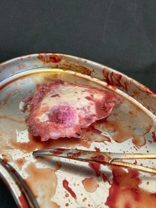 Life cast severed nipple freshly ripped off the victim – comes with bloody surgical tweezers.