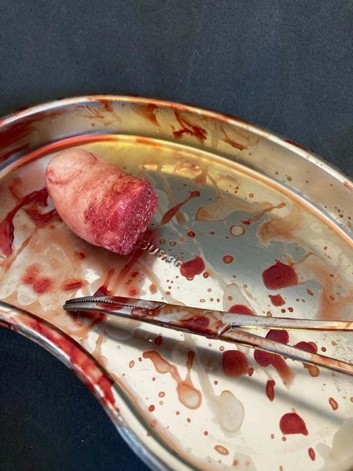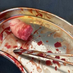 Life cast severed toe which has been freshly amputated and placed on a surgical tray. Comes with bloody surgical tweezers.