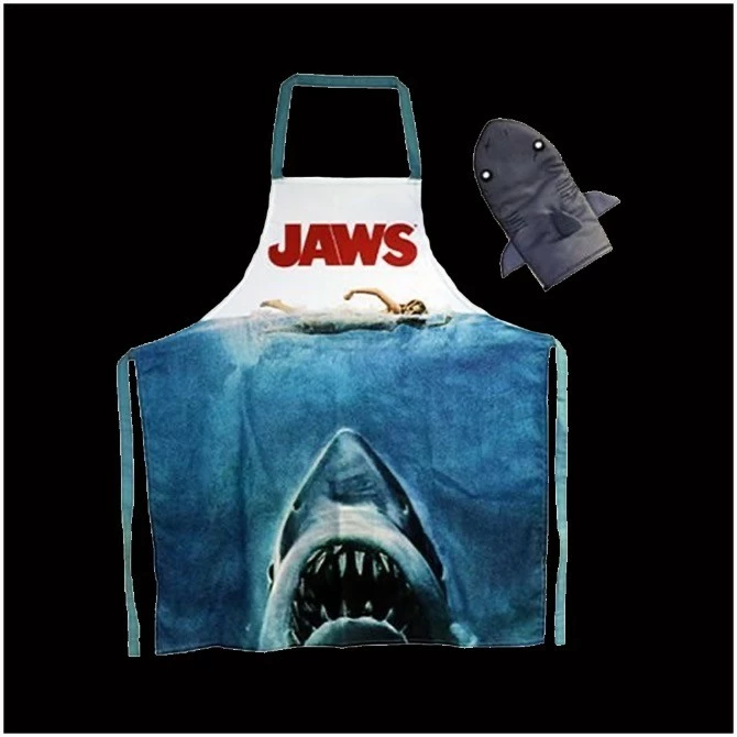 Invite Bruce to your cookouts! Don’t worry – he won’t eat much – ha, ha, ha. This eye-catching Jaws Apron and Oven Glove Set features the iconic movie poster showing the supersized shark and the film’s logo. The logo is also on logo on red, white, and gray glove.